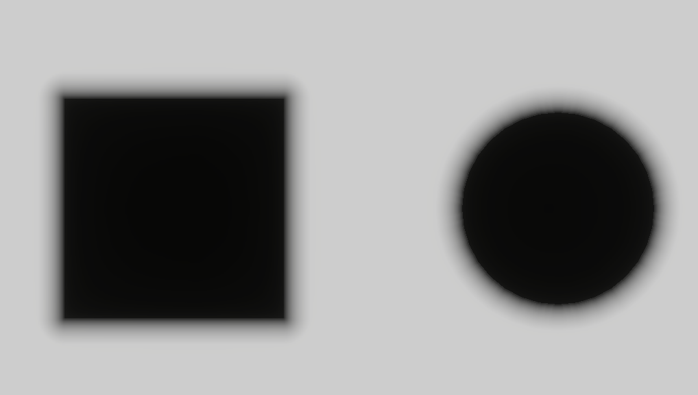We start with analytic geometry. In Lesson 2 - Draw a Circle and Lesson 9 - Draw Ellipses and Rectangles, we already introduced SDFs for circles, ellipses, and rectangles. The distance is 0 on shape boundaries and inside shapes. The figure below visualizes it in grayscale, mapping raw distance into [0,1] with saturate(d * DIST_FIELD_VIZ_SCALE):